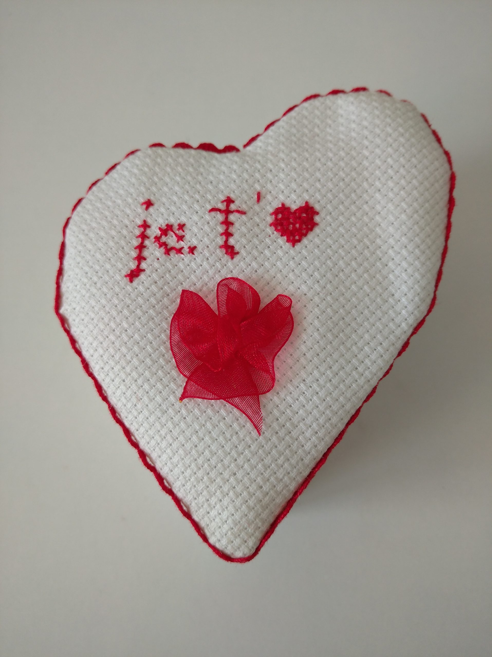 Coeur brodé sur toile aïda et rembourrage couvercle, cerclé d'une dentelle rouge